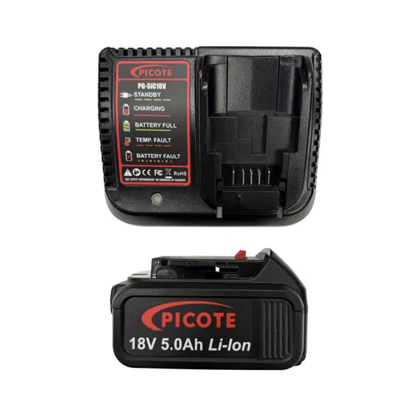 1 x single slot battery charger, 1 x Picote Li-ion 18V 5.0Ah battery, 1 x XS tool bag